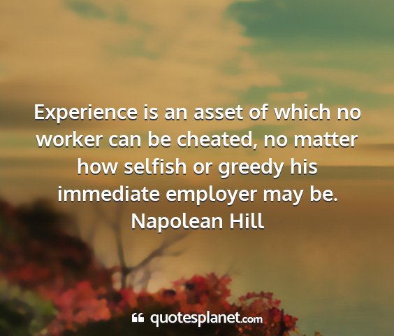 Experience is an asset of which no worker can be cheated, no matter how selfish or greedy his immediate employer may be.Napolean Hill