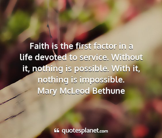 Faith is the first factor in a life devoted to service. Without it, nothing is possible. With it, nothing is impossible.Mary McLeod Bethune