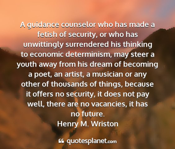 A guidance counselor who has made a fetish of security, or who has unwittingly surrendered his thinking to economic determinism, may steer a youth away from his dream of becoming a poet, an artist, a musician or any other of thousands of things, because it offers no security, it does not pay well, there are no vacancies, it has no future.Henry M. Wriston