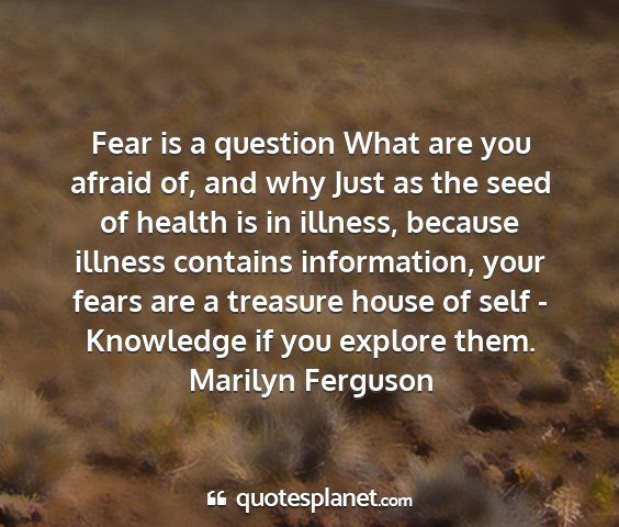 Fear is a question What are you afraid of, and why Just as the seed of health is in illness, because illness contains information, your fears are a treasure house of self - Knowledge if you explore them.Marilyn Ferguson