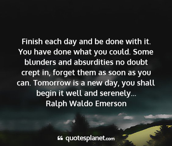 Finish each day and be done with it. You have done what you could. Some blunders and absurdities no doubt crept in, forget them as soon as you can. Tomorrow is a new day, you shall begin it well and serenely...Ralph Waldo Emerson