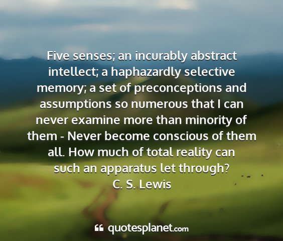Five senses; an incurably abstract intellect; a haphazardly selective memory; a set of preconceptions and assumptions so numerous that I can never examine more than minority of them - Never become conscious of them all. How much of total reality can such an apparatus let through?C. S. Lewis