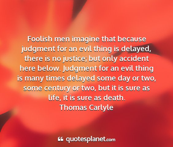 Foolish men imagine that because judgment for an evil thing is delayed, there is no justice; but only accident here below. Judgment for an evil thing is many times delayed some day or two, some century or two, but it is sure as life, it is sure as death.Thomas Carlyle