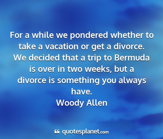 For a while we pondered whether to take a vacation or get a divorce. We decided that a trip to Bermuda is over in two weeks, but a divorce is something you always have.Woody Allen