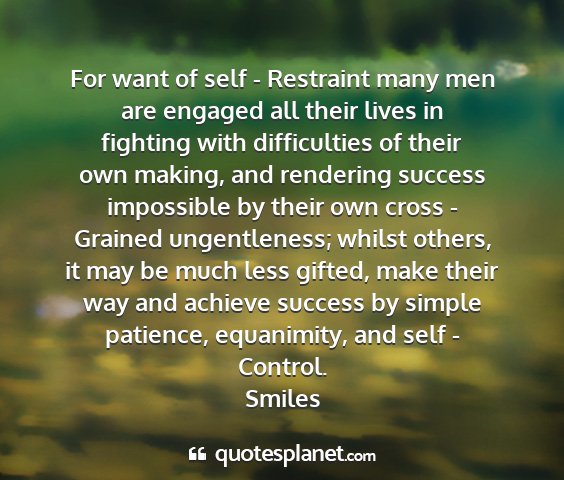 For want of self - Restraint many men are engaged all their lives in fighting with difficulties of their own making, and rendering success impossible by their own cross - Grained ungentleness; whilst others, it may be much less gifted, make their way and achieve success by simple patience, equanimity, and self - Control.Smiles