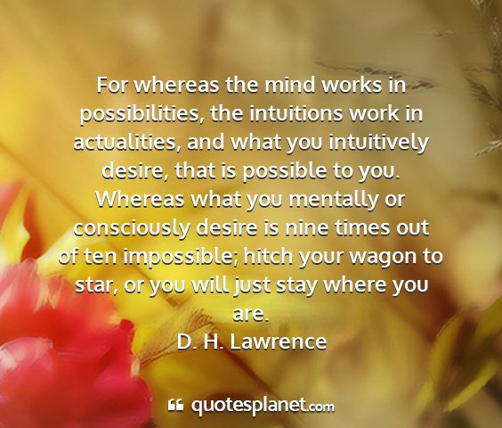 For whereas the mind works in possibilities, the intuitions work in actualities, and what you intuitively desire, that is possible to you. Whereas what you mentally or consciously desire is nine times out of ten impossible; hitch your wagon to star, or you will just stay where you are.D. H. Lawrence