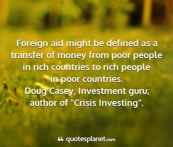 Foreign aid might be defined as a transfer of money from poor people in rich countries to rich people in poor countries.Doug Casey, Investment guru; author of "Crisis Investing".