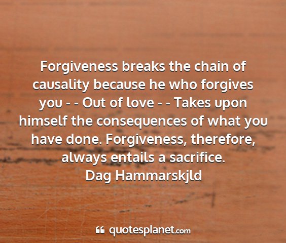 Forgiveness breaks the chain of causality because he who forgives you - - Out of love - - Takes upon himself the consequences of what you have done. Forgiveness, therefore, always entails a sacrifice.Dag Hammarskjld