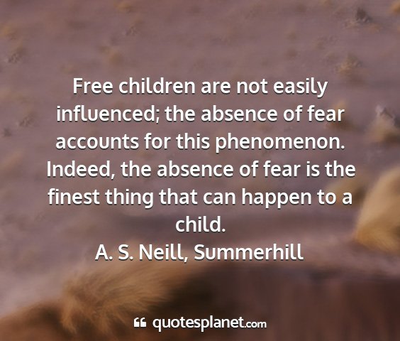 Free children are not easily influenced; the absence of fear accounts for this phenomenon. Indeed, the absence of fear is the finest thing that can happen to a child.A. S. Neill, Summerhill
