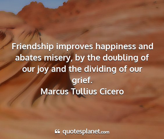 Friendship improves happiness and abates misery, by the doubling of our joy and the dividing of our grief.Marcus Tullius Cicero