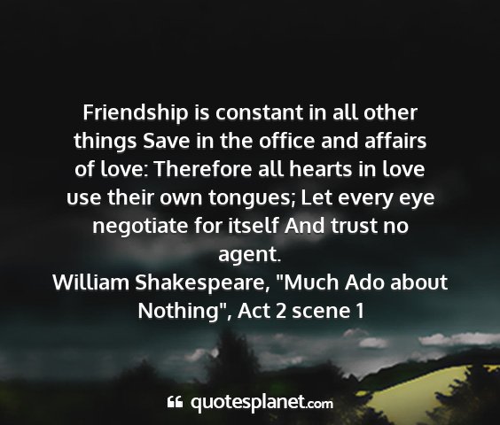 Friendship is constant in all other things Save in the office and affairs of love: Therefore all hearts in love use their own tongues; Let every eye negotiate for itself And trust no agent.William Shakespeare, "Much Ado about Nothing", Act 2 scene 1
