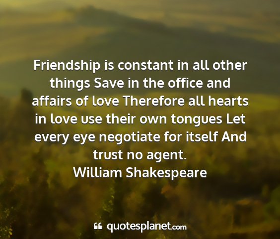 Friendship is constant in all other things Save in the office and affairs of love Therefore all hearts in love use their own tongues Let every eye negotiate for itself And trust no agent.William Shakespeare
