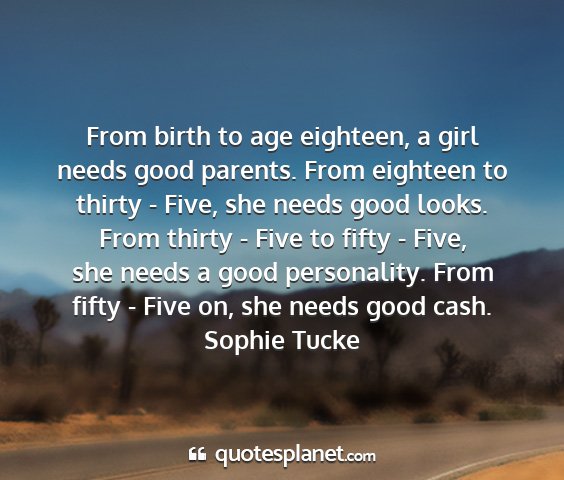 From birth to age eighteen, a girl needs good parents. From eighteen to thirty - Five, she needs good looks. From thirty - Five to fifty - Five, she needs a good personality. From fifty - Five on, she needs good cash.Sophie Tucke