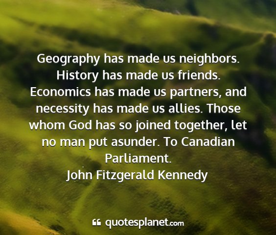 Geography has made us neighbors. History has made us friends. Economics has made us partners, and necessity has made us allies. Those whom God has so joined together, let no man put asunder. To Canadian Parliament.John Fitzgerald Kennedy