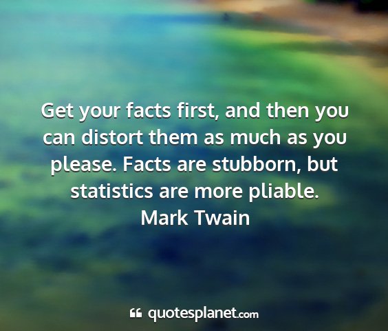 Get your facts first, and then you can distort them as much as you please. Facts are stubborn, but statistics are more pliable.Mark Twain