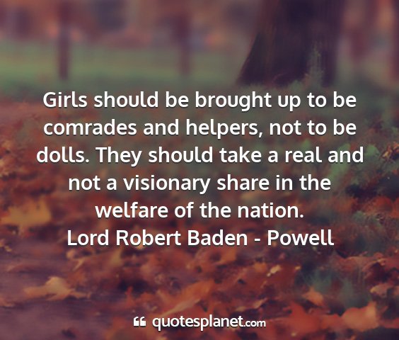 Girls should be brought up to be comrades and helpers, not to be dolls. They should take a real and not a visionary share in the welfare of the nation.Lord Robert Baden - Powell