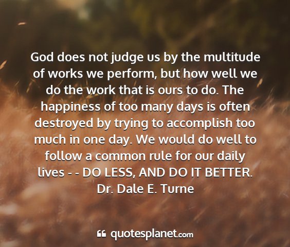 God does not judge us by the multitude of works we perform, but how well we do the work that is ours to do. The happiness of too many days is often destroyed by trying to accomplish too much in one day. We would do well to follow a common rule for our daily lives - - DO LESS, AND DO IT BETTER.Dr. Dale E. Turne