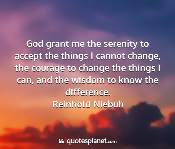 God grant me the serenity to accept the things I cannot change, the courage to change the things I can, and the wisdom to know the difference.Reinhold Niebuh