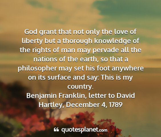 God grant that not only the love of liberty but a thorough knowledge of the rights of man may pervade all the nations of the earth, so that a philosopher may set his foot anywhere on its surface and say: This is my country.Benjamin Franklin, letter to David Hartley, December 4, 1789