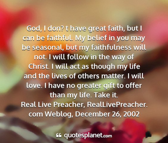 God, I don? t have great faith, but I can be faithful. My belief in you may be seasonal, but my faithfulness will not. I will follow in the way of Christ. I will act as though my life and the lives of others matter. I will love. I have no greater gift to offer than my life. Take it.Real Live Preacher, RealLivePreacher. com Weblog, December 26, 2002