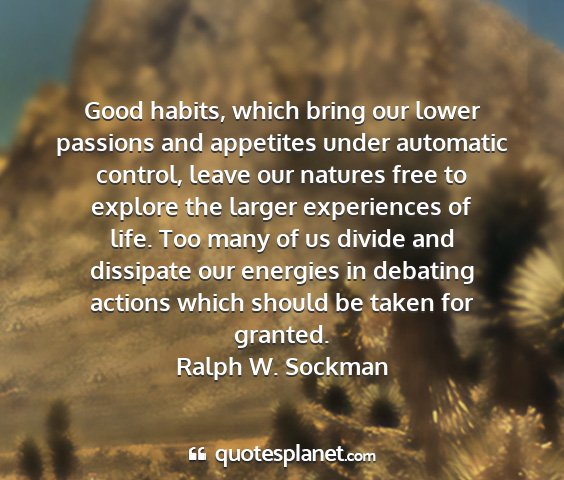 Good habits, which bring our lower passions and appetites under automatic control, leave our natures free to explore the larger experiences of life. Too many of us divide and dissipate our energies in debating actions which should be taken for granted.Ralph W. Sockman