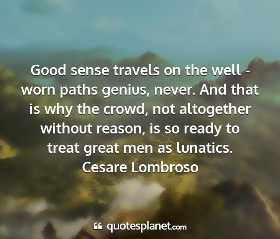 Good sense travels on the well - worn paths genius, never. And that is why the crowd, not altogether without reason, is so ready to treat great men as lunatics.Cesare Lombroso