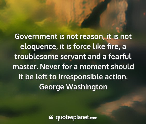 Government is not reason, it is not eloquence, it is force like fire, a troublesome servant and a fearful master. Never for a moment should it be left to irresponsible action.George Washington