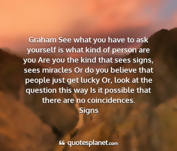 Graham See what you have to ask yourself is what kind of person are you Are you the kind that sees signs, sees miracles Or do you believe that people just get lucky Or, look at the question this way Is it possible that there are no coincidences.Signs