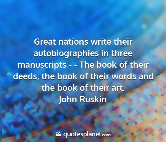 Great nations write their autobiographies in three manuscripts - - The book of their deeds, the book of their words and the book of their art.John Ruskin