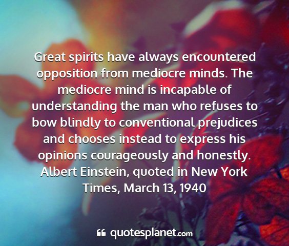 Great spirits have always encountered opposition from mediocre minds. The mediocre mind is incapable of understanding the man who refuses to bow blindly to conventional prejudices and chooses instead to express his opinions courageously and honestly.Albert Einstein, quoted in New York Times, March 13, 1940