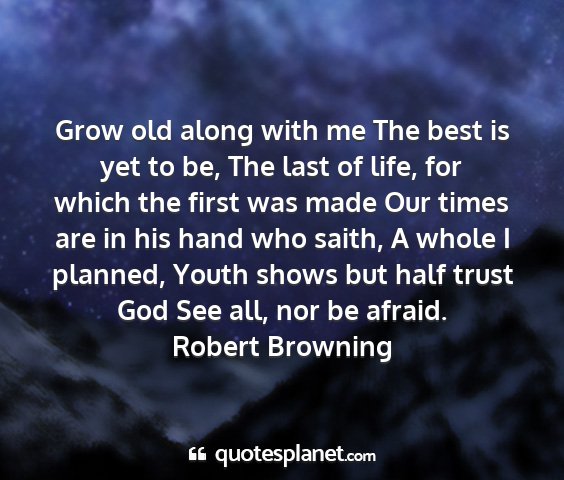 Grow old along with me The best is yet to be, The last of life, for which the first was made Our times are in his hand who saith, A whole I planned, Youth shows but half trust God See all, nor be afraid.Robert Browning
