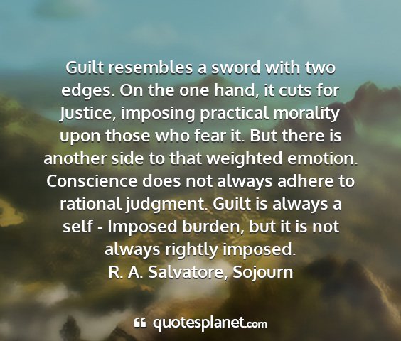 Guilt resembles a sword with two edges. On the one hand, it cuts for Justice, imposing practical morality upon those who fear it. But there is another side to that weighted emotion. Conscience does not always adhere to rational judgment. Guilt is always a self - Imposed burden, but it is not always rightly imposed.R. A. Salvatore, Sojourn