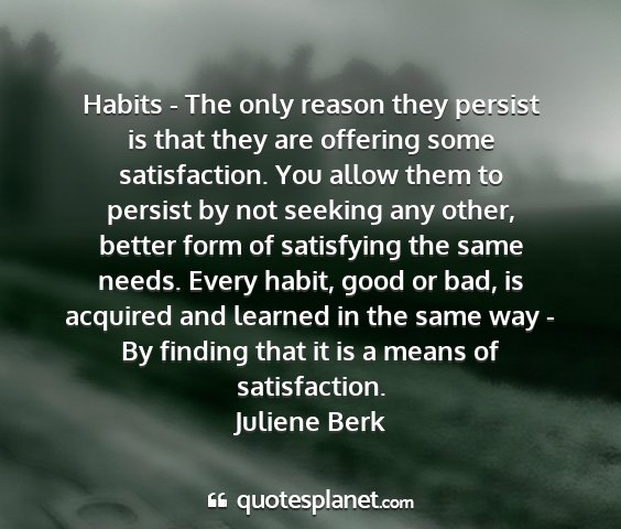 Habits - The only reason they persist is that they are offering some satisfaction. You allow them to persist by not seeking any other, better form of satisfying the same needs. Every habit, good or bad, is acquired and learned in the same way - By finding that it is a means of satisfaction.Juliene Berk