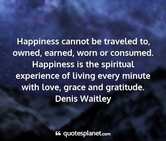 Happiness cannot be traveled to, owned, earned, worn or consumed. Happiness is the spiritual experience of living every minute with love, grace and gratitude.Denis Waitley