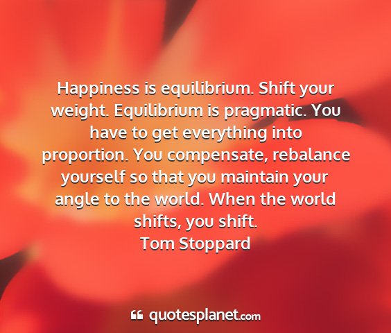 Happiness is equilibrium. Shift your weight. Equilibrium is pragmatic. You have to get everything into proportion. You compensate, rebalance yourself so that you maintain your angle to the world. When the world shifts, you shift.Tom Stoppard