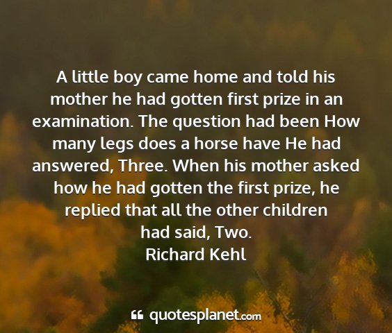 A little boy came home and told his mother he had gotten first prize in an examination. The question had been How many legs does a horse have He had answered, Three. When his mother asked how he had gotten the first prize, he replied that all the other children had said, Two.Richard Kehl