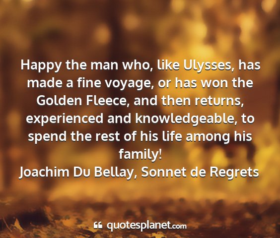 Happy the man who, like Ulysses, has made a fine voyage, or has won the Golden Fleece, and then returns, experienced and knowledgeable, to spend the rest of his life among his family!Joachim Du Bellay, Sonnet de Regrets