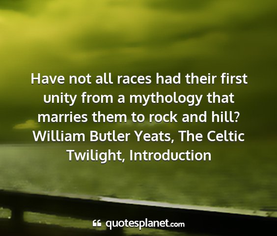 Have not all races had their first unity from a mythology that marries them to rock and hill?William Butler Yeats, The Celtic Twilight, Introduction