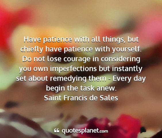 Have patience with all things, but chiefly have patience with yourself. Do not lose courage in considering you own imperfections but instantly set about remedying them - Every day begin the task anew.Saint Francis de Sales
