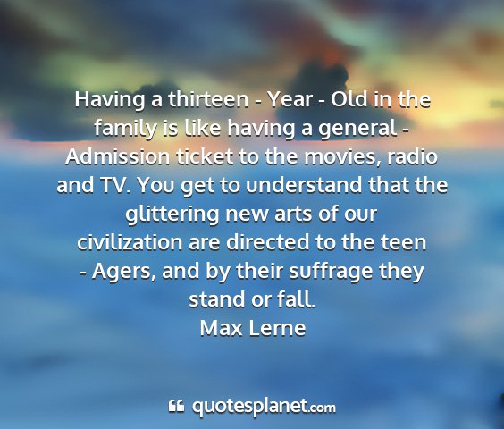 Having a thirteen - Year - Old in the family is like having a general - Admission ticket to the movies, radio and TV. You get to understand that the glittering new arts of our civilization are directed to the teen - Agers, and by their suffrage they stand or fall.Max Lerne