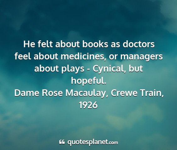 He felt about books as doctors feel about medicines, or managers about plays - Cynical, but hopeful.Dame Rose Macaulay, Crewe Train, 1926