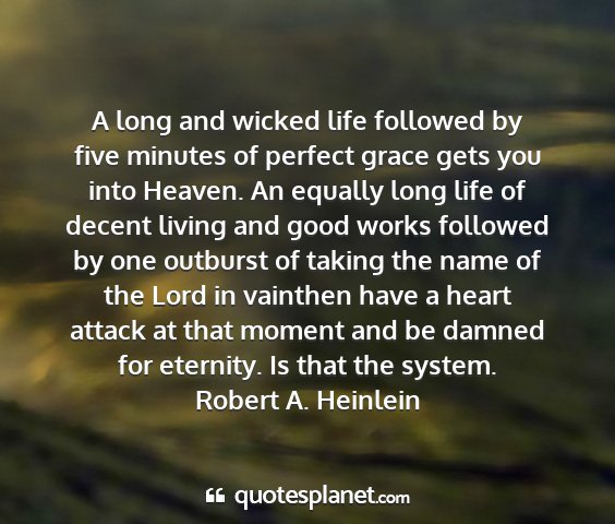 A long and wicked life followed by five minutes of perfect grace gets you into Heaven. An equally long life of decent living and good works followed by one outburst of taking the name of the Lord in vainthen have a heart attack at that moment and be damned for eternity. Is that the system.Robert A. Heinlein