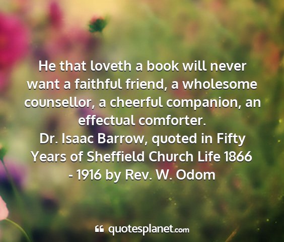 He that loveth a book will never want a faithful friend, a wholesome counsellor, a cheerful companion, an effectual comforter.Dr. Isaac Barrow, quoted in Fifty Years of Sheffield Church Life 1866 - 1916 by Rev. W. Odom