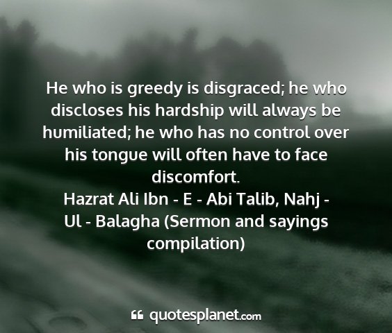 He who is greedy is disgraced; he who discloses his hardship will always be humiliated; he who has no control over his tongue will often have to face discomfort.Hazrat Ali Ibn - E - Abi Talib, Nahj - Ul - Balagha (Sermon and sayings compilation)