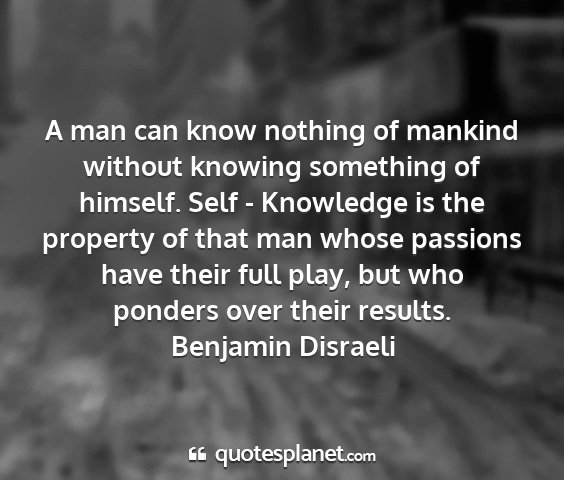 A man can know nothing of mankind without knowing something of himself. Self - Knowledge is the property of that man whose passions have their full play, but who ponders over their results.Benjamin Disraeli