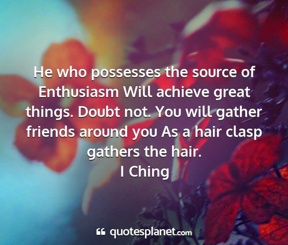 He who possesses the source of Enthusiasm Will achieve great things. Doubt not. You will gather friends around you As a hair clasp gathers the hair.I Ching