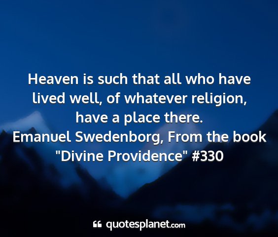 Heaven is such that all who have lived well, of whatever religion, have a place there.Emanuel Swedenborg, From the book "Divine Providence" #330