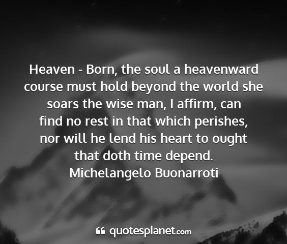Heaven - Born, the soul a heavenward course must hold beyond the world she soars the wise man, I affirm, can find no rest in that which perishes, nor will he lend his heart to ought that doth time depend.Michelangelo Buonarroti