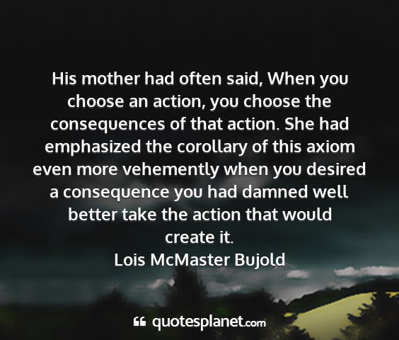 His mother had often said, When you choose an action, you choose the consequences of that action. She had emphasized the corollary of this axiom even more vehemently when you desired a consequence you had damned well better take the action that would create it.Lois McMaster Bujold