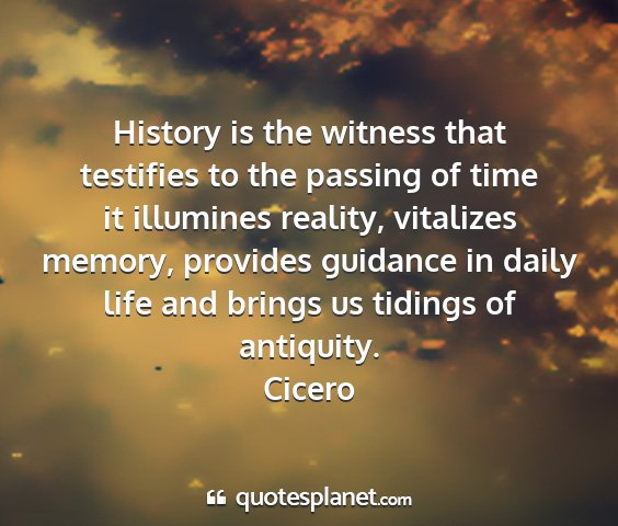 History is the witness that testifies to the passing of time it illumines reality, vitalizes memory, provides guidance in daily life and brings us tidings of antiquity.Cicero